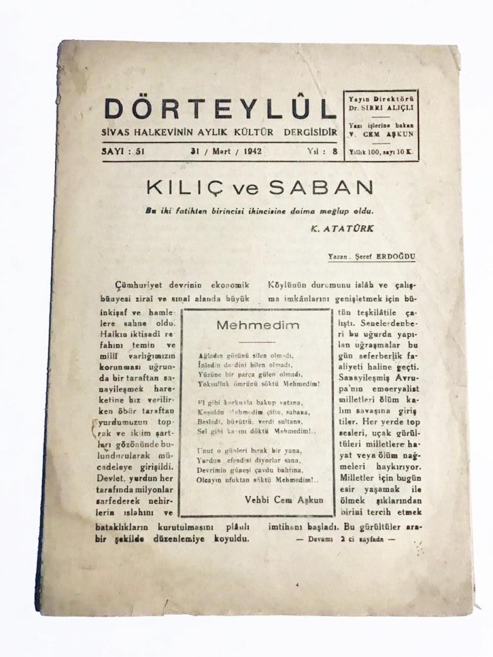 Dörteylül - Sivas Halkevinin Aylık Kültür Dergisi / 31 Mart 1942 MYQTB98DXA Dörteylül - Sivas Halkevinin Aylık Kültür Dergisi / 31 Mart 1942
