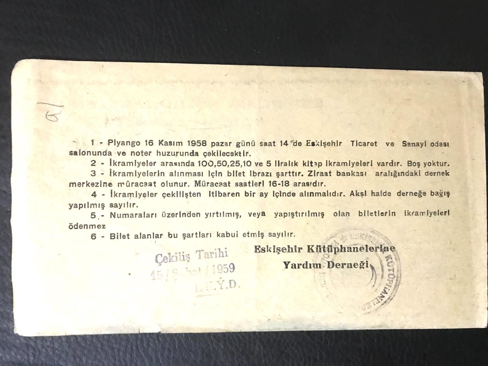 Eskişehir kütüphanelerine yardım derneği Kitap Piyangosu - 1959 FX0659