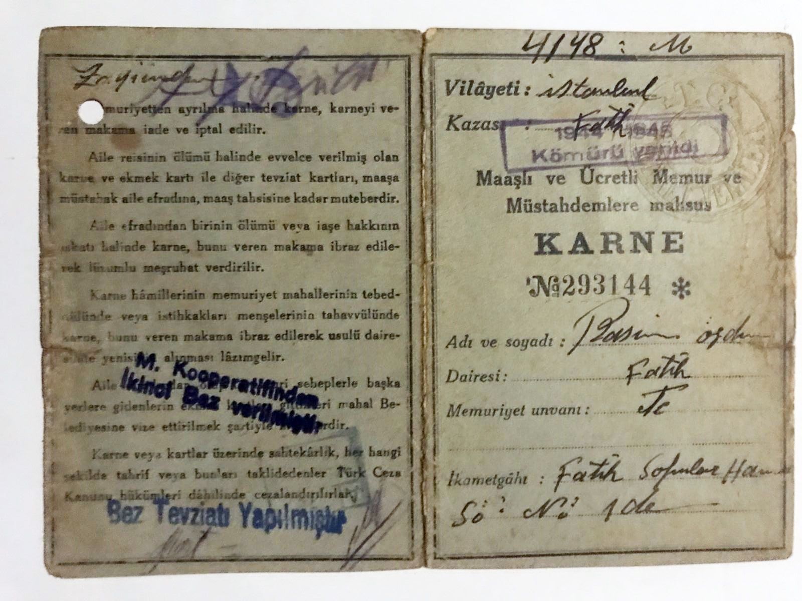 FATİH 1944 Yılı Kömür, bez vs. yardımlar için karne