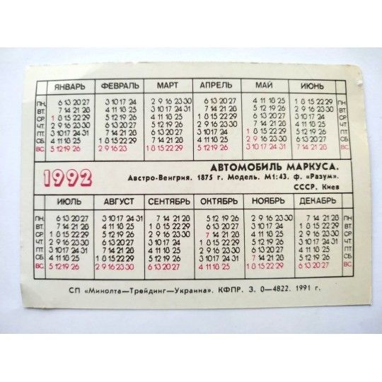 Klasik Otomobil Markusa 1992 MINOLTA - Sovyet Sosyalist Cumhuriyetler Birliği dönemi cep takvimi
