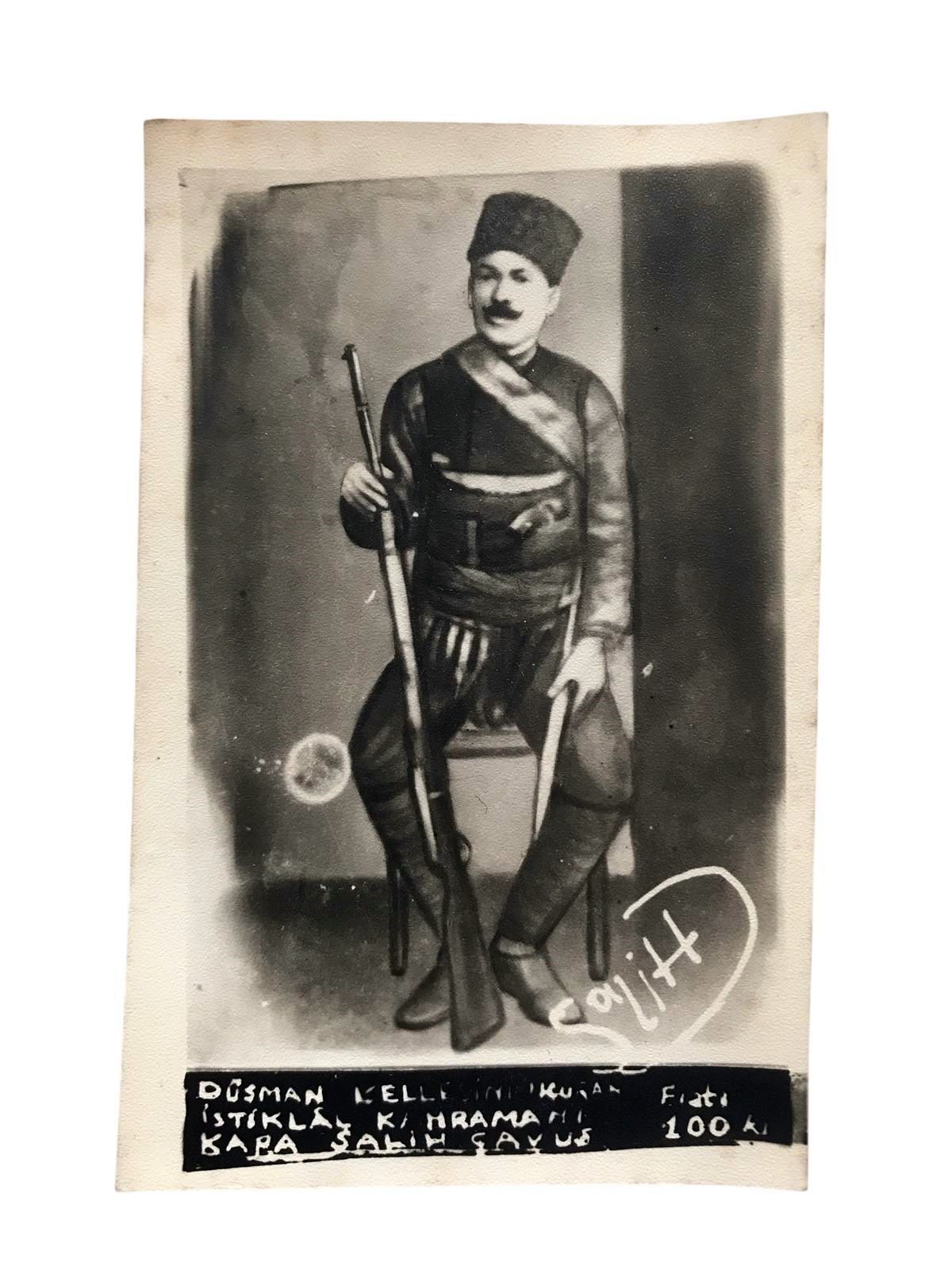 İstiklal Savaşı’nın kazanılmasında canını dişine takan, Anadolu’nun yiğit evlatlarından Kara Çavuş’a ait bu nadir foto kart, şanlı tarihimizin somut bir belgesidir. Cepheden gelen vakur duruşuyla bu parça, sadece bir fotoğraf değil, bir bağımsızlık hikayesinin yansımasıdır.